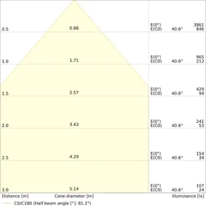 De gradenbundel geeft informatie over hoe breed het licht wordt uitgestraald. Dit zit tussen de 0 en 360 graden (D). Hoe kleiner de hoek, hoe specifieker de lichtbundel is. Over het algemeen is een smalle gradenbundel perfect voor sfeer- of accentverlichting, terwijl een brede gradenbundel ideaal is om grote oppervlaktes te verlichten.