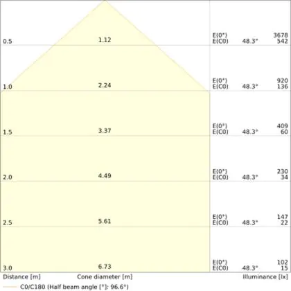 De gradenbundel geeft informatie over hoe breed het licht wordt uitgestraald. Dit zit tussen de 0 en 360 graden (D). Hoe kleiner de hoek, hoe specifieker de lichtbundel is. Over het algemeen is een smalle gradenbundel perfect voor sfeer- of accentverlichting, terwijl een brede gradenbundel ideaal is om grote oppervlaktes te verlichten.